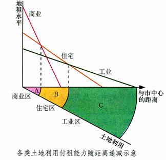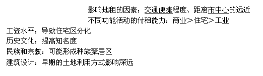 综合以上付租能力和地租两方面的因素,一般在地租最高峰的市中心和地租次高峰的道路相交会处形成商业区;在地租较高的地方,形成住宅区;在地租较低、交通发达的远郊区则形成工业区。