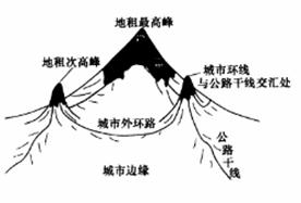 如上图所示,市中心交通最便捷,地租最高;城市环线与公路干线交会处交通便捷程度次之,地租稍