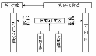 中心附近住宅区的衰落(其原因和过程如下图所示)、城市内污染工厂外迁后改建为住宅区等。