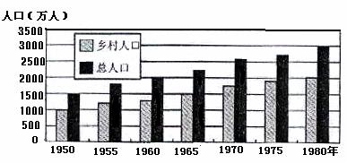 [解析]本题考查学生柱状坐标图的读图与计算能力。第7题参照横坐标和纵坐标,可读出1950年乡村人口为1000万,总人口为1500万,城市人口即为500万;1980年乡村人口为2000万,总人口为3000万,城市人口即为1000万。所以答案为B。第8题,城市化的主要标志是城市人口占总人口的比重。通过图中数据可计算出该地区1950年和1980年城市化水平均为33.3%,没有发生变化。