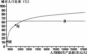 下图是世界各国城市人口比重与人均国民生产总值关系图。回答14-15题。