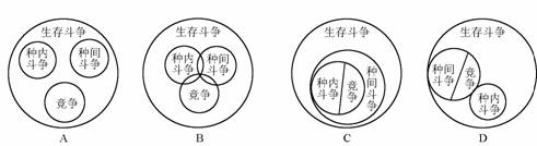 11、下图所示,能正确表示生存斗争、种间斗争、种内斗争和竞争关系的是( )