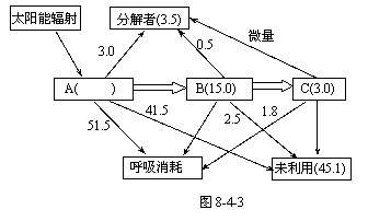 32、(每空2分,共16分)图8-4-3是某湖泊生态系统能量流动的定量分析图解。图中A、B、C代表三个营养级,数字均为实际测得的能量数,单位为百万千焦。已知该生态系统受到的太阳辐射为118872百万千焦,但其中118761百万千焦的能量未被利用。请回答: