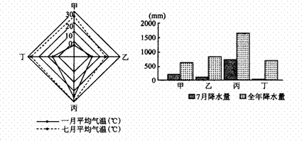 图8为甲、乙、丙、丁四个地区气温雷达图和降水柱状图。读图回答27--28题。