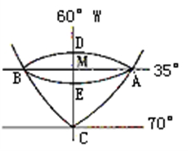 1、某航空大队搞模拟飞行,计划从B地飞往A地,此时的昼夜状况如图所示,图中ACB为晨昏线,飞机从B地起飞时,太阳正位于当地东方地平线上。从B地到A地飞行最近的路线,应该沿: