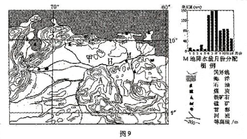 图9中的主要国家是拉丁美洲经济一体化集团的重要成员国。甲国为拉丁美洲人均GDP较高的国家,与中国有良好的贸易关系,2006年8月双方签订了农田灌溉系统建设、矿产品开采、机电生产等多项协议。