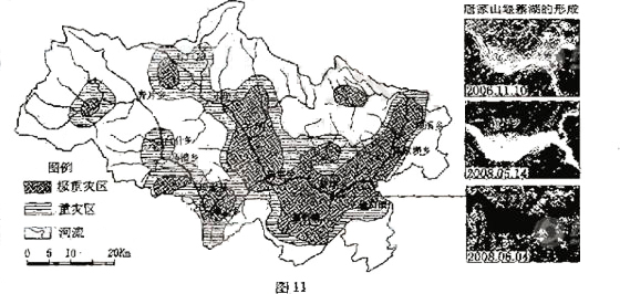 (1)说出汶川地震引发的地质灾害类型。据图说明极重灾区空间分布的特点。(7分)