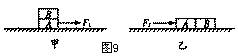 3、如图9甲所示,完全相同的木块A和B叠放在水平桌面上,在12N的水平拉力F1作用下,A、B一起做匀速直线运动,此时木块B所受的摩擦力为 N;若将A、B紧靠着放在水平桌面上,用水平力F2推A使它们一起匀速运动(如图9乙所示),则推力F2= N。