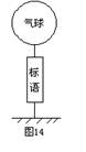 5、如图14所示,为某校校园艺术节时气球悬挂一幅竖标的情景。已知气球的体积为8m3,气球(含内部所充气体)、标语及细绳的总质量为9kg,空气的密度为1.29 kg/ m3.g取10N/ kg,则系于地面拉住标语的细绳的拉力为( )