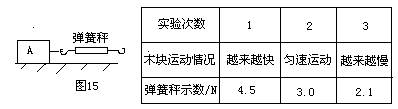 6、如图15,用弹簧秤拉着木块在水平桌面上做直线运动,实验记录如下表。由此可知,木块与水平桌面的滑动摩