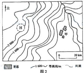 [解析]该题目考察考生的基本学科素养----等高线的判读。H的海拔高度在2000---2200米之间,甲聚落的海拔高度在400-600之间,两地高差在1400---1800之间,故选1500米,也可借助计算公式:(8-1)200<H<(8+1)200,进行两地相对高度的取值界定。