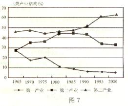 32.读“台湾省图”(图6)、“台湾省三类产业结构变化图”(图7),完成下列各题。(7分)