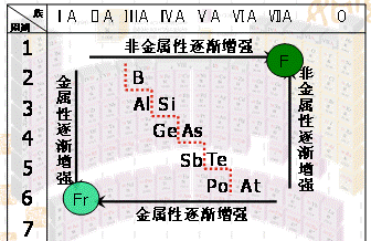 [讲]根据同周期、同主族元素性质的递变规律可推知:金属性最强的元素是铯(Cs),位于第6周期第ⅠA族(左下角),非金属性最强的元素是氟(F),位于第2周期第ⅦA族(右上角)。位于分界线附近的元素既有一定的金属性,又有一定的非金属性,如Al、Si、Ge等