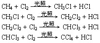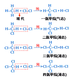 [讲]在反应中CH4分子里的一个H原子被氯气分子里的1个氯原子所代替,但是反应并没有停止,生成的一氯甲烷仍继续跟氯气作用,依次生成二氯甲烷、三氯甲烷(氯仿)、和四氯甲烷 。