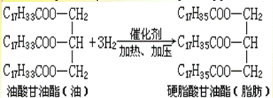 [讲]这个反应叫做油脂的氢化,也叫油脂的硬化。这样制得的油脂叫人造脂肪,通常又叫硬化油。工业上常利用油脂的氢化反应把多种植物油转变成硬化油。硬化油性质稳定,不易变质、便于运输,可用作制造肥皂、脂肪酸、甘油、人造奶油等的原料。