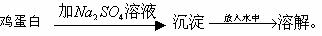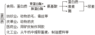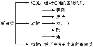 [复习提问]1、人体所需的营养物质是什么? 2、糖类、脂肪的主要化学性质? [引言]脂肪、糖类、蛋白质是人体所需的三大营养物质,它们供给人体所需的全部热能。今天讲第三类营养物质--蛋白质。 [板书]三、蛋白质 1、存在 [问]根据预习和日常生活经验回答:幻灯片中哪些是含蛋白质的物质? [投影]日常生活中常见的几种物质。 [讲]蛋白质广泛存在于生物体内,蛋白质是生命的基础,没有蛋白质就没有生命。 [板书]2、组成和结构: [问]组成蛋白质的元素有哪些? [板书](1)组成:由C、H、0、N、S等元素组成。 [问]蛋白质的基本组成单位是什么? [讲]组成蛋白质的氨基酸大约有二十多种。体内只能合成一部分,其余则须由食物蛋白质供给。体内不能合成或合成速度太慢的氨基酸都必须由食物蛋白质供给,故又称为“必需氨基酸”。体内能自己合成的氨基酸则不必由食物蛋白质供给的又称为“非必需氨基酸”。 必需氨基酸有8种,非必需氨基酸有12种。氨基酸分子里既有酸性基(羧基);又有碱性基(氨基);氨基酸分子之间可以相互缩聚而成高分子。 [投影]常见的氨基酸 甘氨酸 丙氨酸 苯丙氨酸 谷氨酸 氨基酸分子中含有碱性基氨基(-NH2)和酸性基羧基(-COOH),氨基酸呈两性。天然蛋白质水解的最终产物都是α-氨基酸 [板书](2)蛋白质是由多种氨基酸结合而成的天然高分子化合物。 [讲]向学生介绍我国科学家在世界上第一次用人工方法合成了具有生命活力的蛋白质--结晶牛胰岛素。向学生进行爱国主义教育。 [板书]3、蛋白质的性质 [问]蛋白质在酶的作用下发生了什么反应,生成了什么物质? [板书](1) (2)盐析 [演示实验]蛋白质的盐析: [讲]以上实验现象叫盐析。 [板书]加入某些无机盐的浓溶液,可使蛋白质凝聚而从溶液中析出的过程叫盐析。 [问]盐析是否可逆反应,反应过程中蛋白质性质有无改变? [板书](3)变性 [问]鸡蛋加热会发生什么变化?此反应是否可逆反应?为什么?能否恢复成为原来的蛋白质? [讨论]什么是蛋白质的变性? [板书]在热、重金属、酸、碱、某些有机物等作用下,蛋白质发生了性质上的改变而凝结起来,失去其生理活性的过程叫变性。 [问]盐析与变性的区别? [小结] [问]医院用酒精、苯酚溶液杀菌,用福尔马林浸制动物标本,农业上用波尔多液杀灭病虫害,利用了蛋白质的什么性质? [讲]都是使蛋白质凝固从而使细菌死亡,起到杀菌、防腐作用。 [板书](4)颜色反应 [学生分组实验]取一小块鸡皮,置蒸发皿中,滴加3-5滴浓硝酸,在酒精灯上微热, 实验现象:鸡皮变黄色。 [问]不小心把硝酸溅在皮肤上,会有什么变化? 皮肤变黄色。 [板书]硝酸可以使蛋白质变黄,称为蛋白质的颜色反应。 [强调] 颜色反应是检验蛋白质的方法之一。蛋白质变黄说明蛋白质含有苯环。 [板书](5)蛋白质的灼烧 [学生实验]用简单实验方法区别桌上放的毛织物和棉织物。 [问]鉴别方法?解释原因。 [讲]蛋白质灼烧时会产生烧焦羽毛的气味,根据气味可鉴别蛋白质产品。 [板书] 4、蛋白质的用途 [讲]动物的毛和蚕丝的成分都是蛋白质,是重要的纺织原料。动物的皮经药剂鞣制后得到柔软坚韧的皮革。骨、皮等熬煮得到无色透明的动物胶,叫做白明胶,是制造照相感光片和感光纸的原料。牛奶中的蛋白质-酪素还能跟甲醛合成酪素塑料。… [板书] 组成细胞的基础物质、人类营养物质、工业上有广泛应用、酶是特殊蛋白质。 [板书]四、糖类、油脂、蛋白质在生产、生活中的应用(自学) [投影]自学提纲 1、糖类物质的主要应用 (1)葡萄糖和果糖的存在和用途 葡萄糖和果糖 (2)蔗糖的存在和主要用途 蔗糖 (3)淀粉和纤维素的存在和主要用途 淀粉 纤维素 2.油脂的主要应用 (1)油脂的存在:油脂存在于植物的种子、动物的组织和器官中 油脂中的碳链含 碳碳双键时,主要是低沸点的植物油;油脂的碳链为碳碳单键时,主要是高沸点的动物脂肪。 油 (2)油脂的主要用途--食用 油脂+水 油脂是热值最高的食物。 油脂有保持体温和保护内脏器官的功能。 油脂能增强食物的滋味,增进食欲,保证机体的正常生理功能。 油脂增强人体对脂溶性维生素的吸收。 过量地摄入脂肪,可能引发多种疾病。 3.蛋白质的主要应用 (1)氨基酸的种类 氨基酸 (2)蛋白质的存在 (3)蛋白质的主要用途 (4)酶 酶是一类特殊的蛋白质。 酶是生物体内的重要催化剂。 作为催化剂,酶已被应用于工业生产 4.科学视野--生命的化学起源 导致生命起源的化学过程是在有水和无机物存在的条件下发生的:①简单的无机物和有机物转化为生物聚合物;②以第一阶段产生的单体合成有序的生物聚合物;③对第二阶段形成的生物聚合物进行自我复制。 [自我评价] 1.1997年,英国的“克隆羊”备受世界关注。“克隆羊”的关键之一是找到特殊的酶,这些酶能激活普通体细胞使之像生殖细胞一样发育成个体。有关酶的说法中错误的是( A ) A、酶是具有催化作用的蛋白质 B、由题可知酶具有选择性和专一性 C、高温或重金属能降低酶的活性 D、酶只有在强酸、强碱条件下才能发挥作用 2.生活中的一些问题常涉及到化学知识,下列叙述不正确的是( AC ) A、糯米中的淀粉一经水解反应,就酿造成酒 B、福尔马林是一种良好的杀菌剂,但不可用作消毒饮用水 C、棉花和人造丝的主要成份都是纤维素 D、室内装饰材料中缓慢放出的甲醛、甲苯等有机物会污染空气 3.市场上