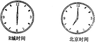 (05扬州一模)某日一位来自R城的游客在北京一宾馆住宿,此时R城的日期和区时与北京都不同(见下图)。回答10-11题。