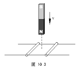 [学员思考]如图10-3所示,在平行、水平的金属导轨上有两根可以自由滚动的金属棒,当它们构成闭合回路正上方有一根条形磁铁向下运动时,两根金属棒会相互靠拢还是相互远离?![]()