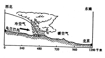 (3)如果图中所示为该日北京时间12点整的锋面活动状况,而锋面移动速度为40千米/小时,则锋面将于次日 点移到北京地区,届时北京地区将出现 等天气现象(选择填空)。 锋面过境后,北京的天气状况将是 (选择填空)。