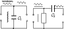 解:电容的作用是“通交流,隔直流”、“通高频,阻低频”,由其表达式XC=1/2πfC可看出:左图中的C1必须用电容小些的,才能使高频交流顺利通过,而低频不易通过,这种电容器叫高频旁路电容器。右图中的C2一般用电容大的,使低频交流电很容易通过,只有直流成分从电阻上通过,这种电容器叫隔直电容器。
