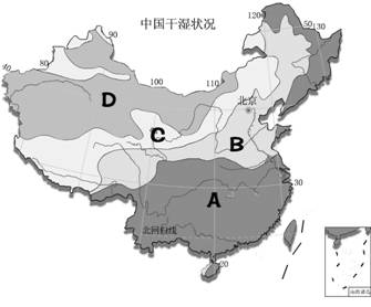 (2)依据降水量和蒸发量的关系,我国可以划分为4个干湿地区:A___________________