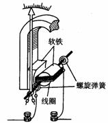 磁电式电流表的构造:如图所示,在一个磁性很强的蹄形磁铁的两极间有一个固定的圆柱形铁芯,铁芯外面套有一个可以绕轴转动的铝框,铝框上绕有线圈,铝框的转轴上装有两个螺旋弹簧和-个指针,线圈的两端分别接在这两个螺旋弹簧上,被测电流经过这两个弹簧流入线圈。