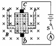 [例2]如图所示是一个可以用来测量磁感应强度的装置.一长方体绝缘容器内部高为L,厚为d,左右两管等高处装有两根完全相同的开口向上的管子a、b,上、下两侧装有电极C(正极)和D(负极),并经开关S与电源连接.容器中注满能导电的液体,液体的密度为ρ.将容器置于一匀强磁场中,磁场方向垂直纸面向里,当开关断开时,竖直管子a、b中的液面高度相同;开关S闭合后,a、b管中液面将出现高度差.若闭合开关S后,a、b管中液面将出现高度差为h,电路中电流表的读数为I,求磁感应强度B的大小.