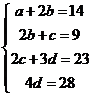 9.(陕西卷)为确保信息安全,信息需加密传输,发送方由明文→密文(加密),接收方由密文→明文(解密),已知加密规则为:明文a,b,c,d对应密文a+2b,2b+c,2c+3d,4d,例如,明文1,2,3,4对应密文5,7,18,16.当接收方收到密文14,9,23,28时,则解密得到的明文为( )