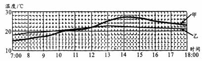 17.(09四川绵阳)星期天,小明同学在父母的协助下,从早上七点开始每隔半小时对他家附近的气温和一个深水池里的水温进行测量,并根据记录的数据绘成温度-时间图象,如图所示。从图线可以看出乙的温度变化幅度小,是___ _(选填“气温”或“水温”)的图线,温度变化幅度小的原因是 。