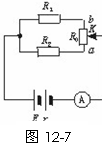 5.(★★★★★)如图12-7所示,电源电动势E=12 V,内阻r=    0.5 Ω,R1=2 Ω,R2=3 Ω,滑动变阻器的总电阻R0=5 Ω,试分析:在滑动片Ka端移至b端的过程中,电流表A的示数如何变化?