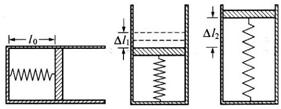 ★★★★11.如图所示,竖直放置的气缸内盛有气体,上面被一活塞盖住,活塞通过劲度系数k=600N/m的弹簧与气缸相连接,系统处于平衡状态.已知此时外界大气压强p0=1.00×105N/m?,活塞到缸底的距离t=0.500m,缸内横截面积S=1.00×10-2m2.今在等温条件下将活塞缓慢上提到距缸底为2l处,此时提力为F=500N.弹簧的原长l0应为多少?若提力为F=700N,弹簧的原长l0又应为多少(不计摩擦及活塞和弹簧的质量,并假定在整个过程中,气缸不漏气,弹簧都遵从胡克定律)?(2002年北京春季高考试题)