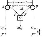 ★★★★17.如图所示,质量为m的运动员站在质量为m的均匀长板AB的中点,板位于水平地面上,可绕通过A点的水平轴无摩擦转动.板的B端系有轻绳,轻绳的另一端绕过两个定滑轮后,握在运动员的手中.当运动员用力拉绳子时,滑轮两侧的绳子都保持在竖直方向,则要使板的B端离开地面,运动员作用于绳的最小拉力是______.[5]