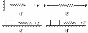 解析 四种形式拉弹簧过程中,由于弹力大小都为F,由胡克定律x =