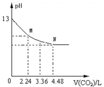 [解析]选C。A项,NaOH溶液的pH为13,c(OH-)为0.1mol/L;B项,4.48L CO2物质的量为0.2mol,0.2mol CO2可与NaOH恰好完全反应生成NaHCO3 ,所以NaOH溶液的体积为0.2mol÷ 0.1mol/L﹦2L。C项,M点对应 CO2物质的量为0.1mol,0.1 mol CO2可与NaOH恰好完全反应生成Na2CO3,溶液中粒子浓度的大小关系c(CO32-)>c(HCO3-);D项,M、N点对应的溶液中的溶质分别为 Na2CO3 、NaHCO3,两者水解都显碱性,pH大于7。