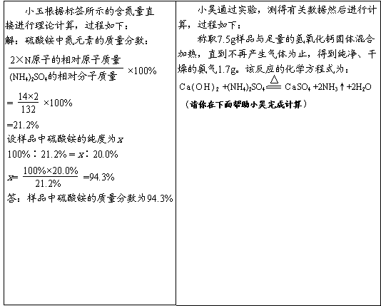 (6分)肥田粉是常用的氮肥,右图为某品牌肥田粉的部分标签,为了计算该品牌肥田粉的纯度(硫酸铵的质量分数),小玉和小昊采用了两种不同的方法。