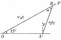 例. 有一个很大的湖,岸边(可视湖岸为直线)停放着一艘小船,缆绳突然断开,小船被风刮跑,其方向与湖岸成15°角,速度为2.5km/h。同时岸上一人从停放点起追赶小船,已知他在岸上跑的速度为4.0km/h,在水中游的速度为2.0km/h,问此人能否追及小船?