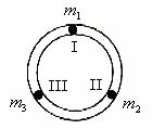 的速率运动。因为三段圆弧相等,当m3运动到位置I时,m1恰好返回。它们在I处的碰撞,m3停在I处,m1又以v0的速度顺时针运动。当m1再运动到II时,共经历了一个周期的