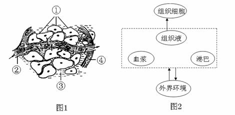 (1)人体的内环境主要由 (填标号)组成,请在图2中添加箭头完成体内细胞通过内环境进行物质交换的模型。