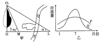 甲图中OM、OL分别是北半球某地树木OO1一年中正午日影最短和最长的影子,ML与河流PQ段正好垂直;乙图为P、Q两水文站测得河流流量的年变化曲线。据此回答31-32题.