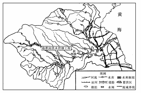 (2)蓄洪区分洪是为了削减淮河洪峰对下游的影响(或减少下游人民生命财产所受损失)。临淮岗洪水控制工程提高了淮河中下游防洪能力(或几乎控制了淮河干流在其以上的全部洪水)。怀洪新河:分洪、防涝、灌溉、航运等。