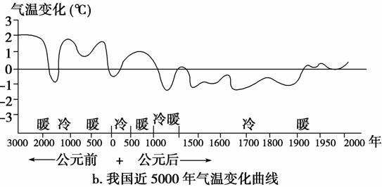 解析:选D。由图b可知我国目前正处于冷暖交替过程中的温暖期,且近五千年来气温的波动值超过了3℃。由图a可知近三十年来,大气中二氧化碳的体积分数不断增加,保温作用增强。