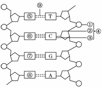 9.某双链DNA分子含有200个碱基,一条链上A∶T∶G∶C=1∶2∶3∶4,则该DNA分子                                 ( )