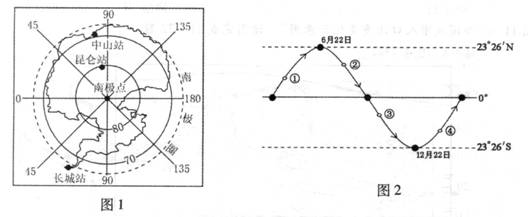 图1为“我国三个南极科学考察站分布示意图”,其中昆仑站于2009年1月27日建成,这是我国在南极内陆建立的第一个科学考察站。图2为“太阳直射点回归运动示意图”。完成4一5题。