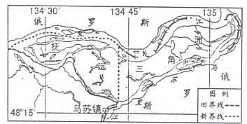 2008年10月14日上午,中俄双方黑瞎子岛(又称抚远三角洲)举行“中俄界碑揭牌仪式”,黑瞎子岛西侧一半的岛屿正式归属中国。读“中俄黑瞎子岛边界示意图”,回答9-10题。