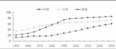 读中国、日本和韩国三国城市化进程曲线图,(根据人口学的纳瑟姆曲线,城市化率超过30%时,国家将进入高速城市化的阶段,直至城市化水平达到70%左右)回答68-69题。