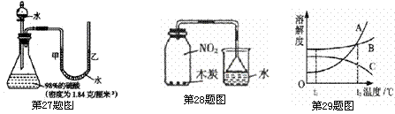 28.二氧化氮是一种红棕色的气体,将几粒木炭放入盛有二氧化氮的集气瓶中,如图所示,观察到的现象是 、 解释产生这些现象的原因是 。