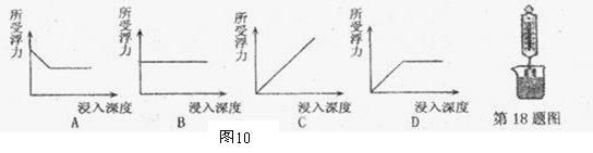 18.如图10所示将一铁块用弹簧测力计悬挂起来,并逐渐浸人水中,下列能正确表示铁块所受浮力与浸入深度关系的是( )