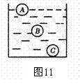 体积相同,密度不同的三个实心小球A、B、C,放入同种液体中静止时,所处位置如图11所示。则三个小球密度大小的关系是( )