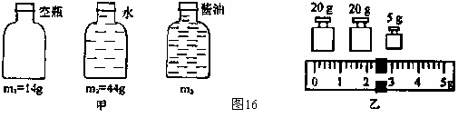 24.小刚同学想测酱油的密度,但家里只有天平、小空瓶,而没有量筒。他思考后按照自己设计的实验步骤进行了测量,测量内容及结果如图16所示。