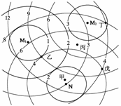 11.某企业生产必需的两种原料分别来源于M1、M2,N是该企业的唯一市场,以M1、M2为圆心的同心圆分别代表生产单位产品所需两种原料的等运费线,以N为圆心的同心圆代表单位产品的等运费线,如果仅考虑运费因素,下列四个地点建厂最合适的是 ( )